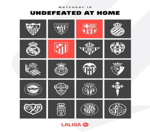 据西甲官方统计,截至西甲联赛19轮,巴塞罗那与马德里竞技是唯二两支联赛主场保持不败的球队。
