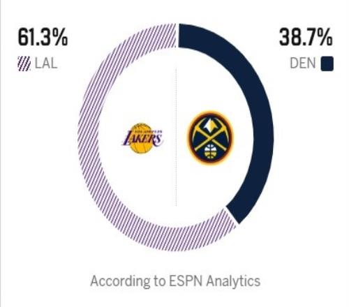 ESPN预测明日胜率:湖人61.3%,掘金38.7%。